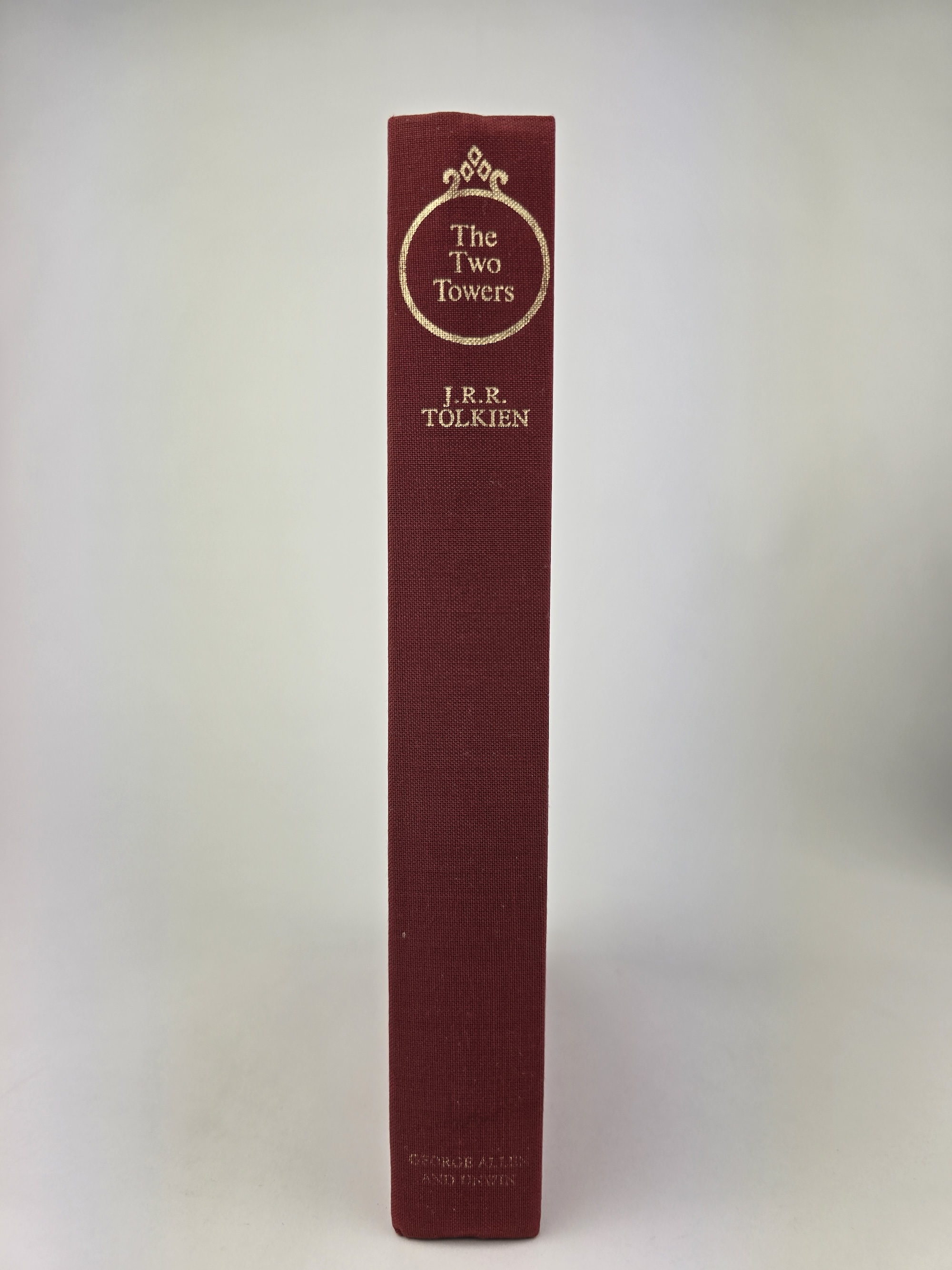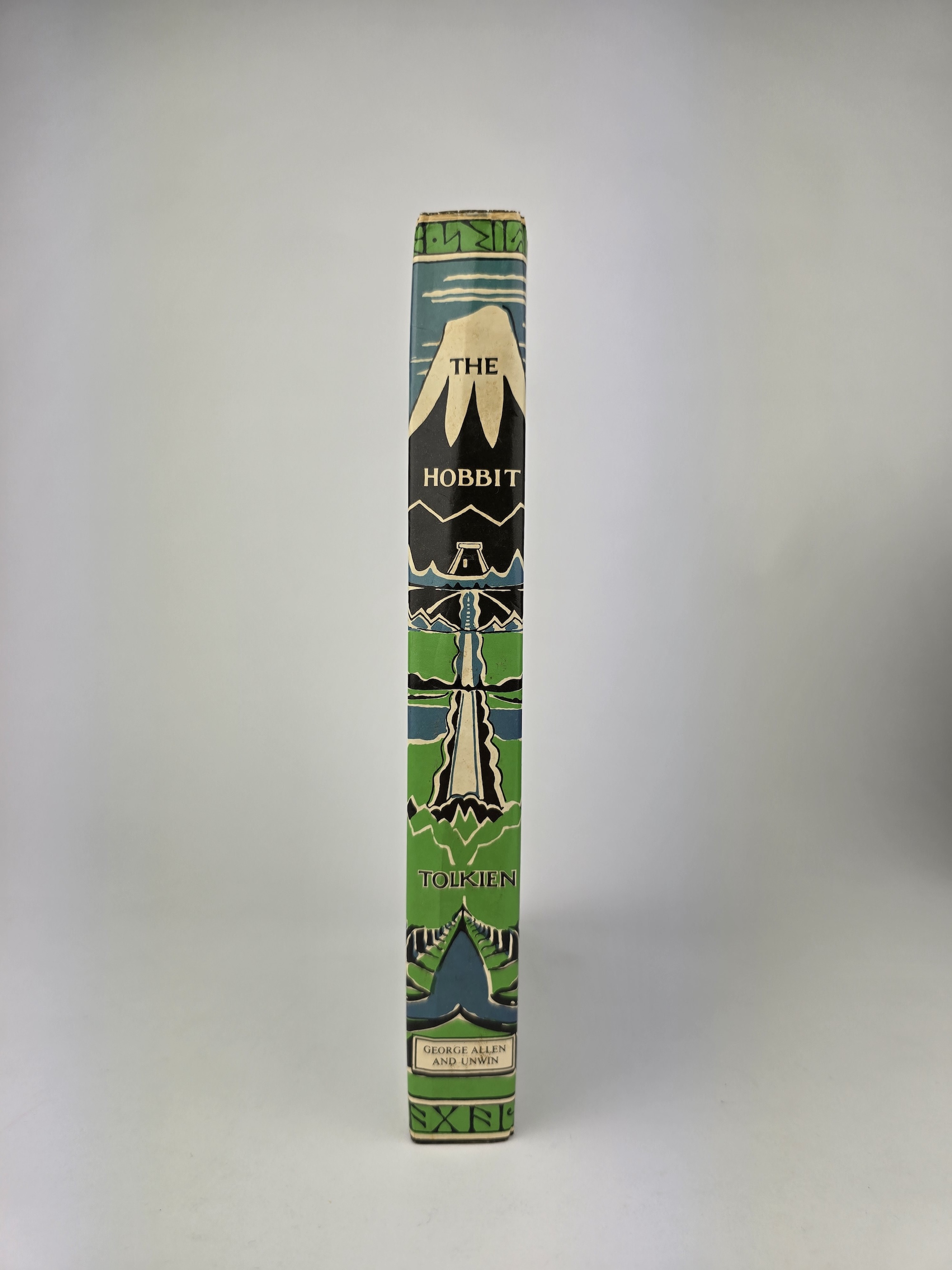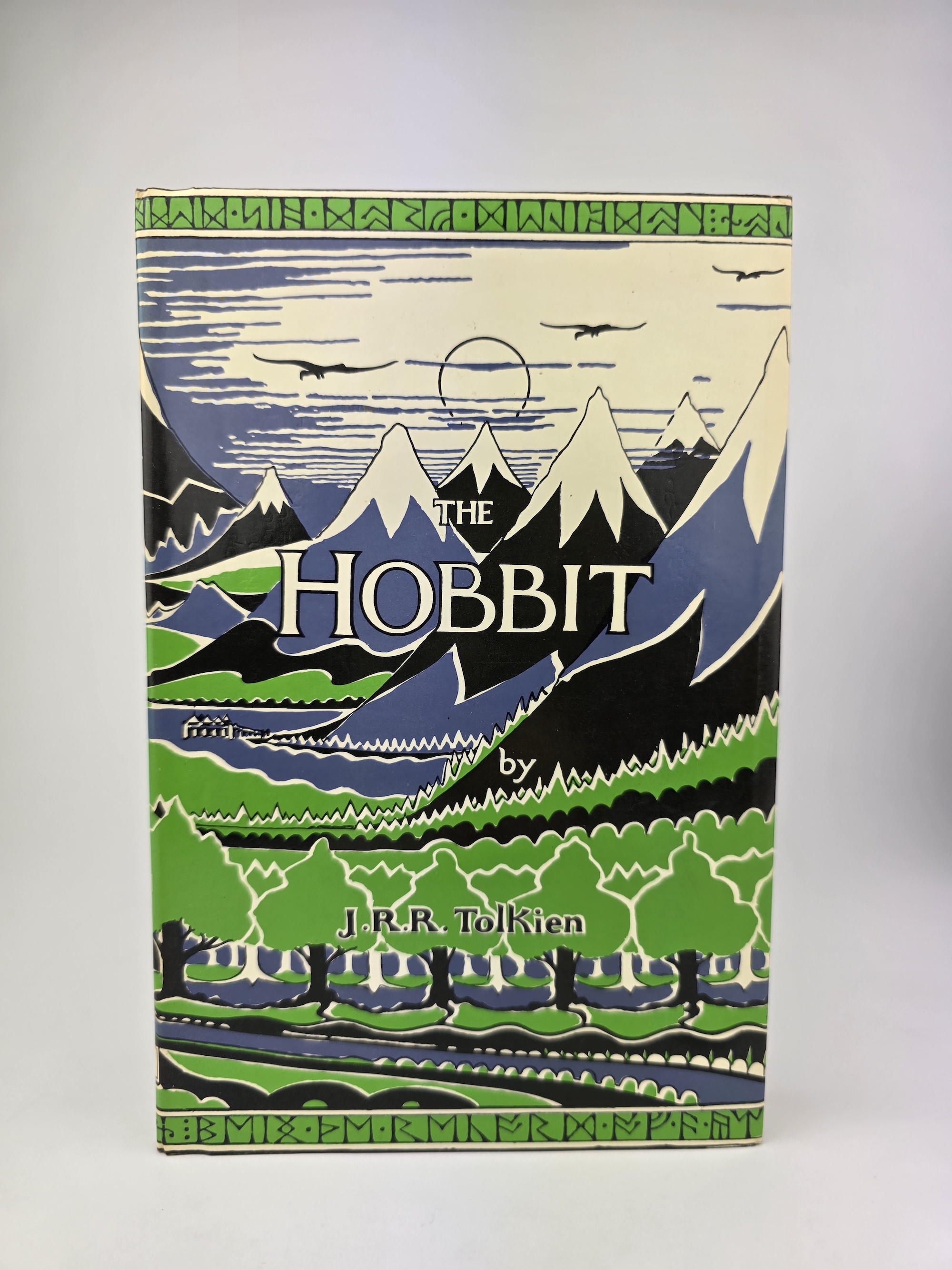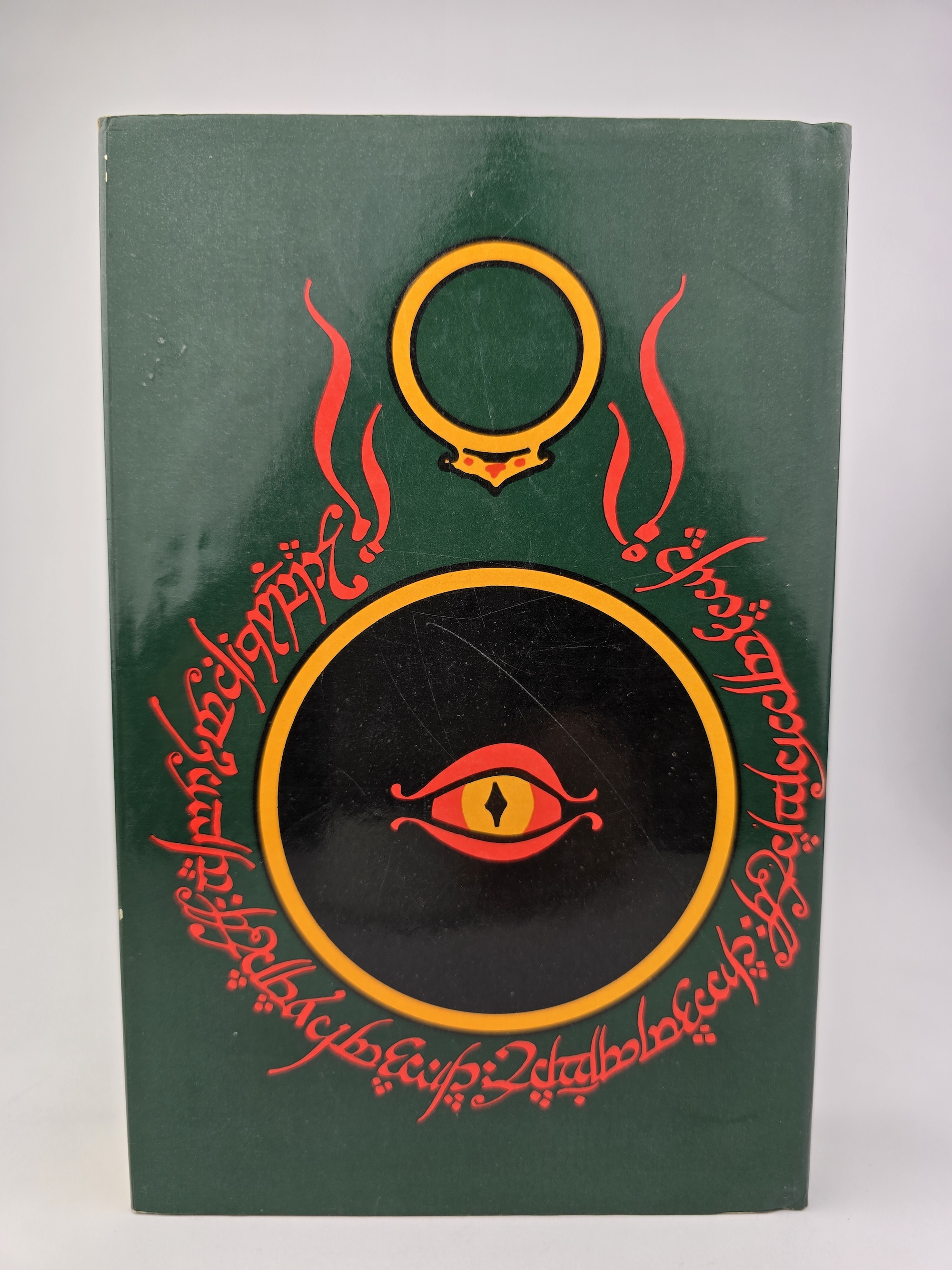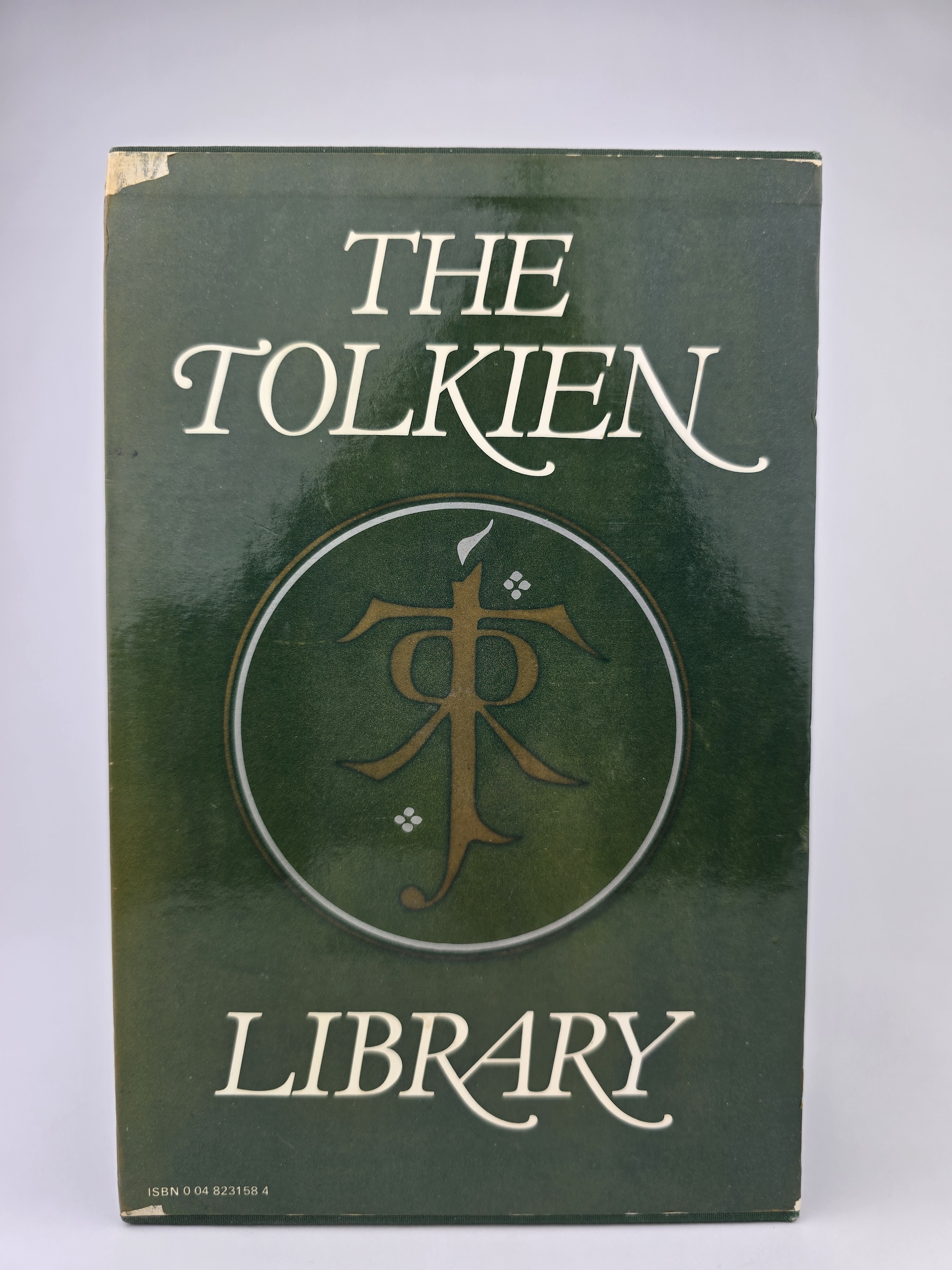 The original publisher’s slipcase is present and remains solid, showing expected rubbing and light edge wear but still very presentable, with the Tolkien monogram device bright on all panels.