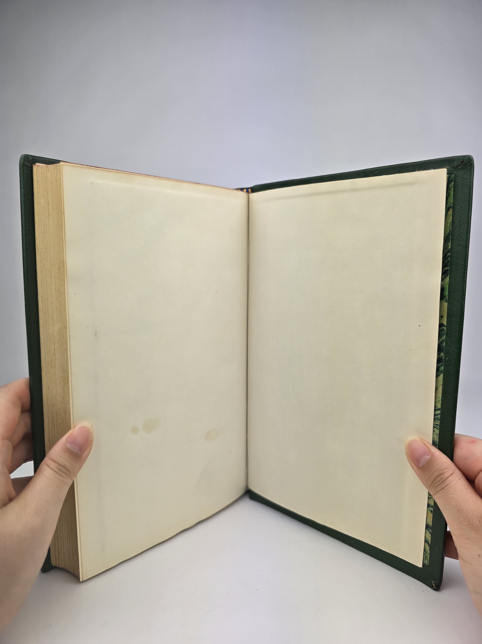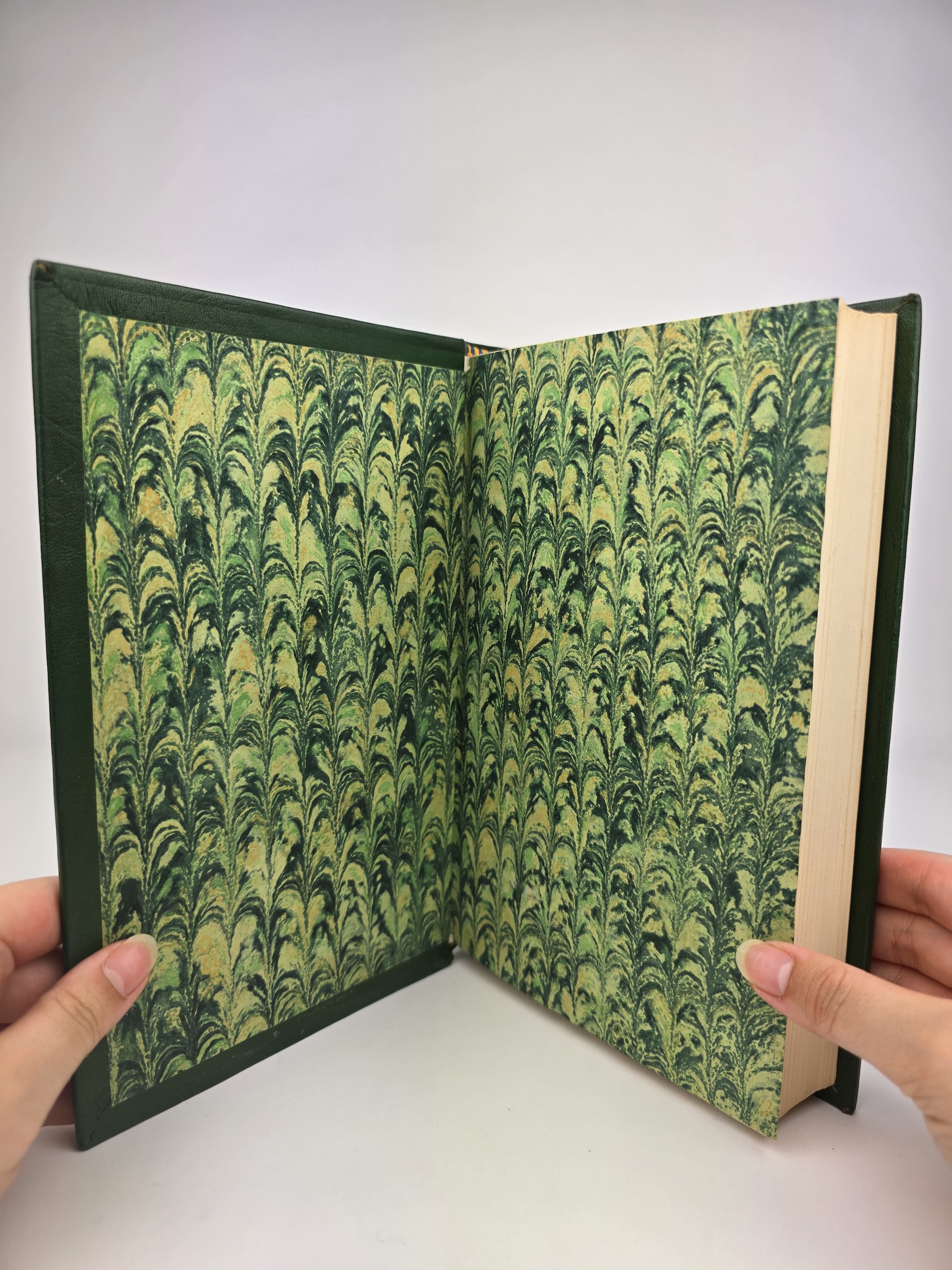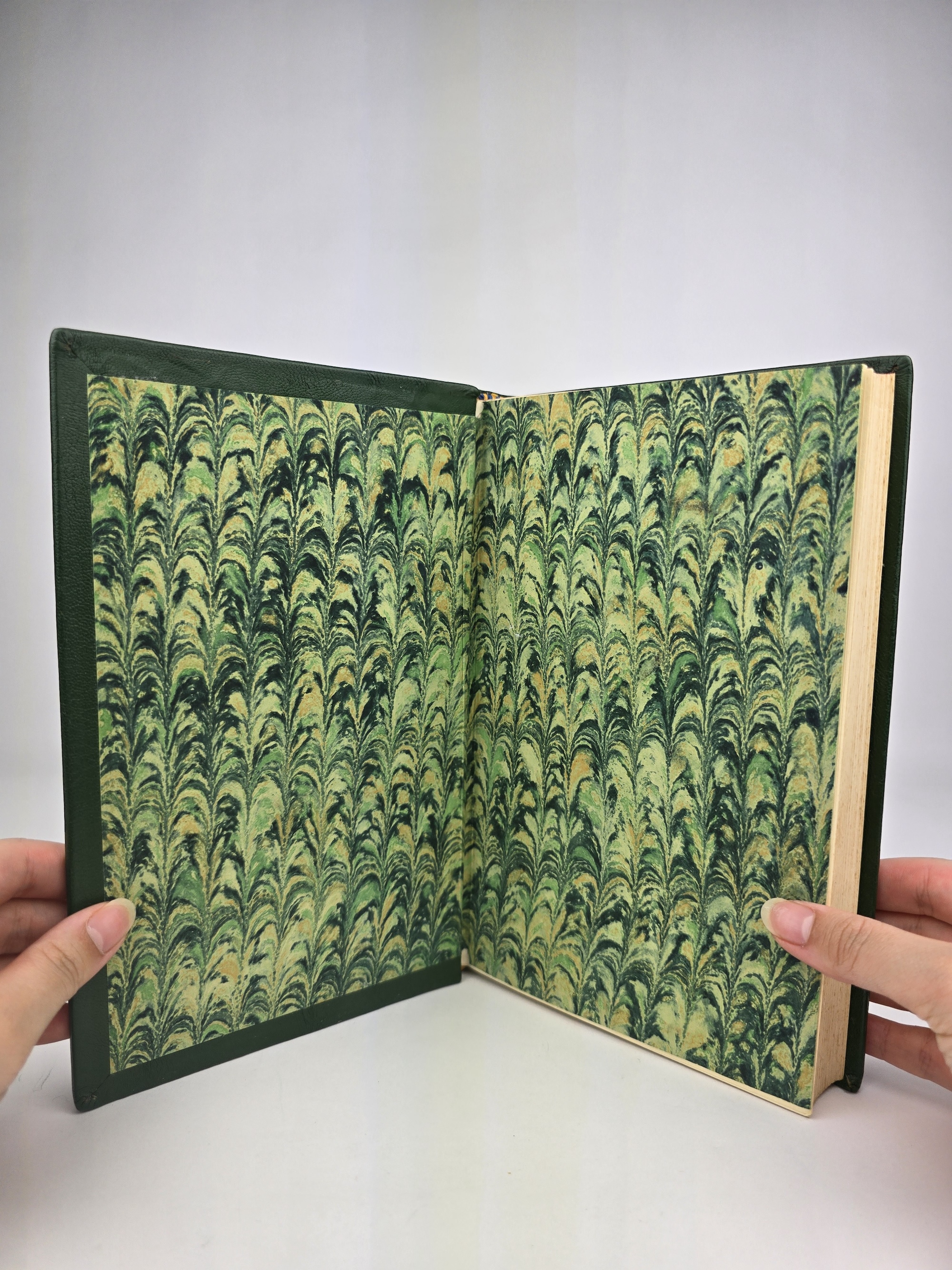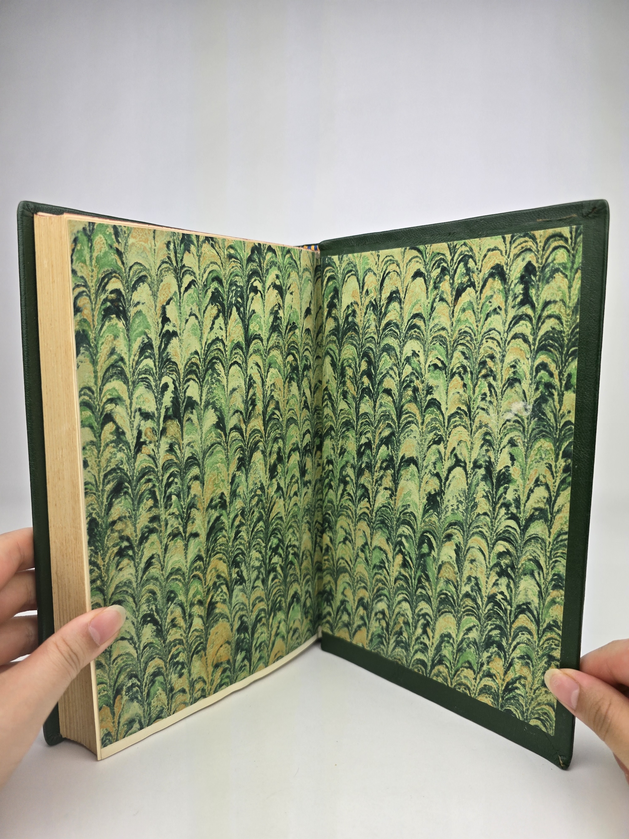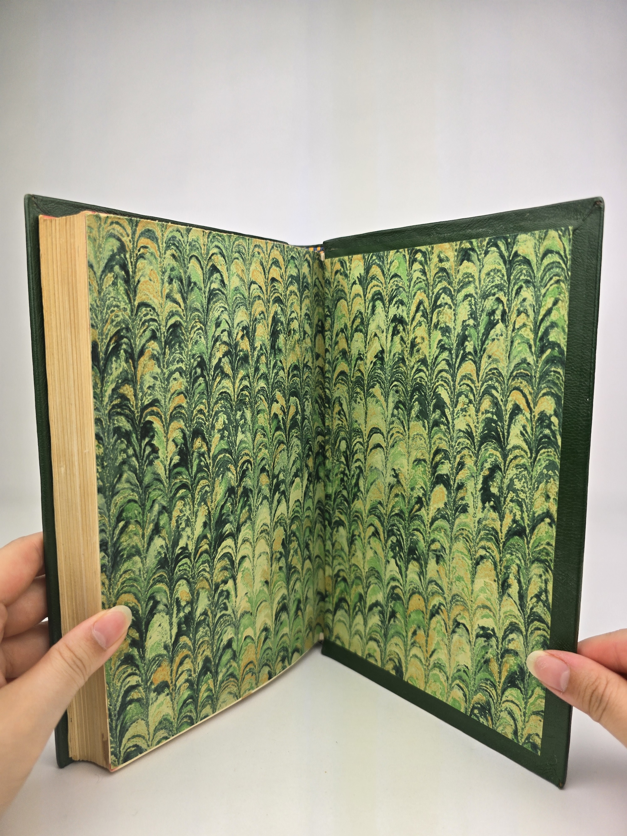 Each volume has been handsomely bound in full green leather with raised bands to the spine, red and black title labels, and decorative marbled endpapers. The top page edges are tinted maroon. All three maps are present and in excellent condition.