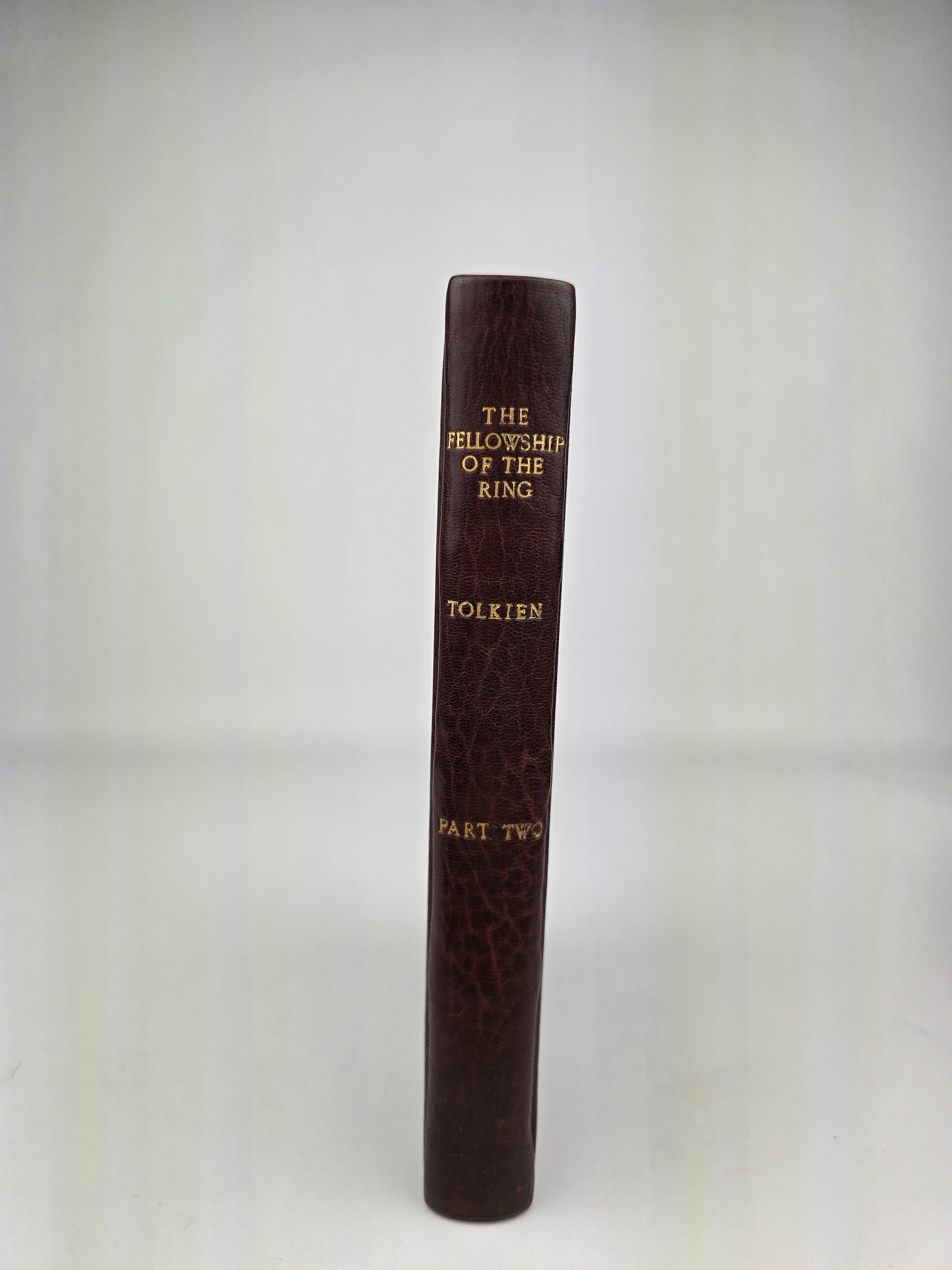 The volumes are titled uniformly on the spine as Part One, Part Two, and Part Three, under the main title The Fellowship of the Ring—a rebinding decision, not reflective of the book’s actual structure. One volume has top edge gilt; the other two have all edges gilt. Interiors are clean, with a neat 1959 ownership inscription in each.