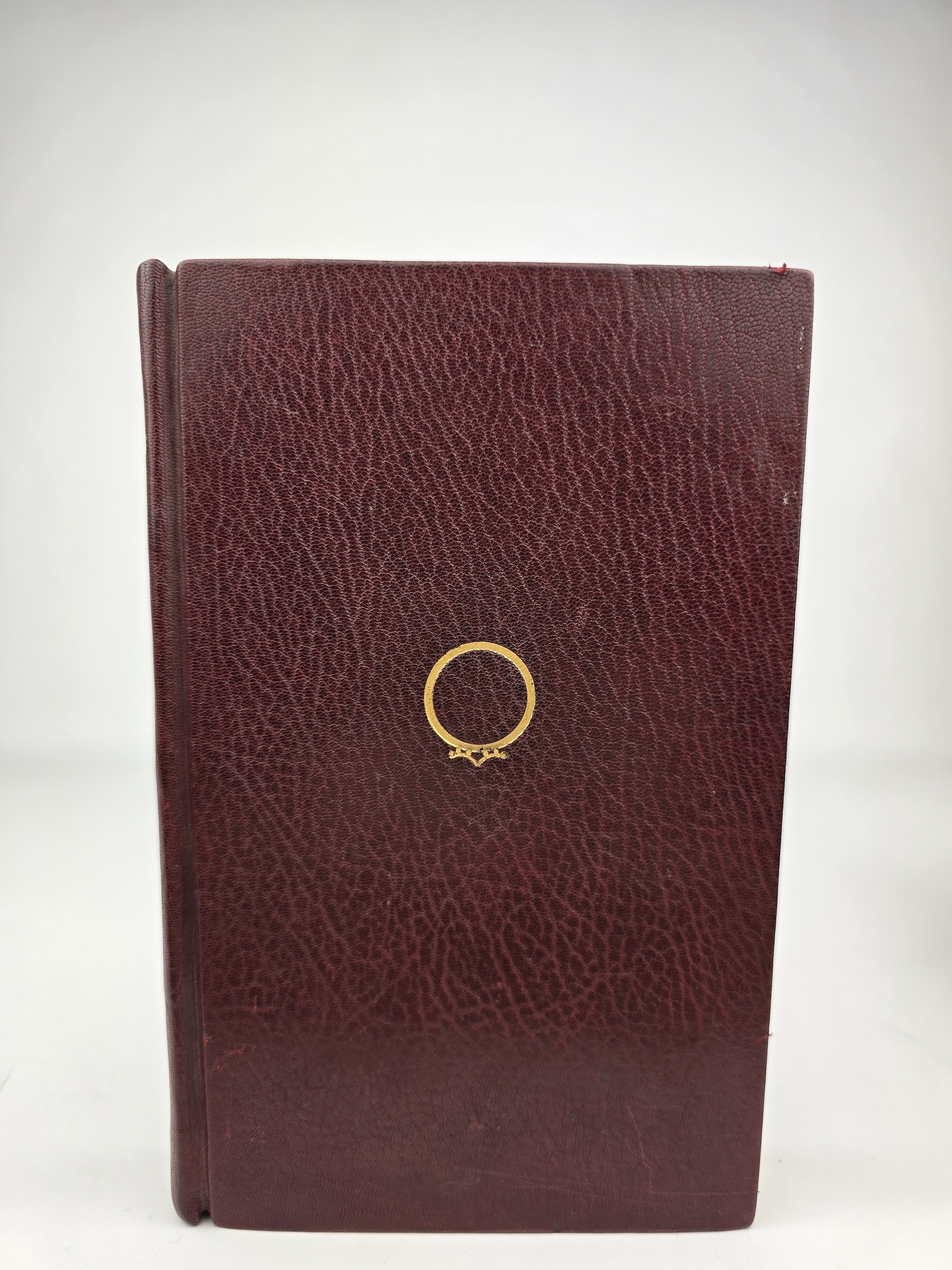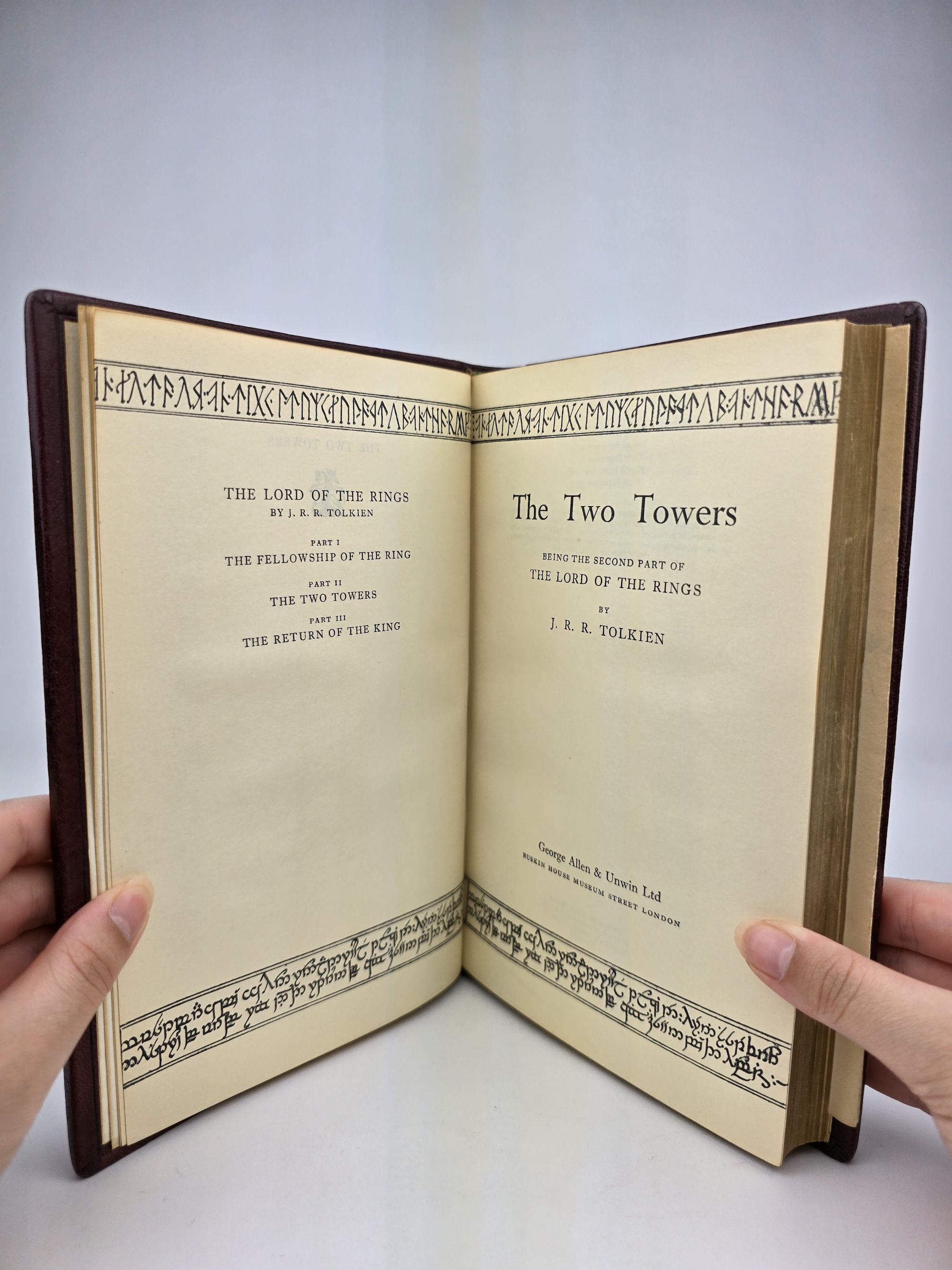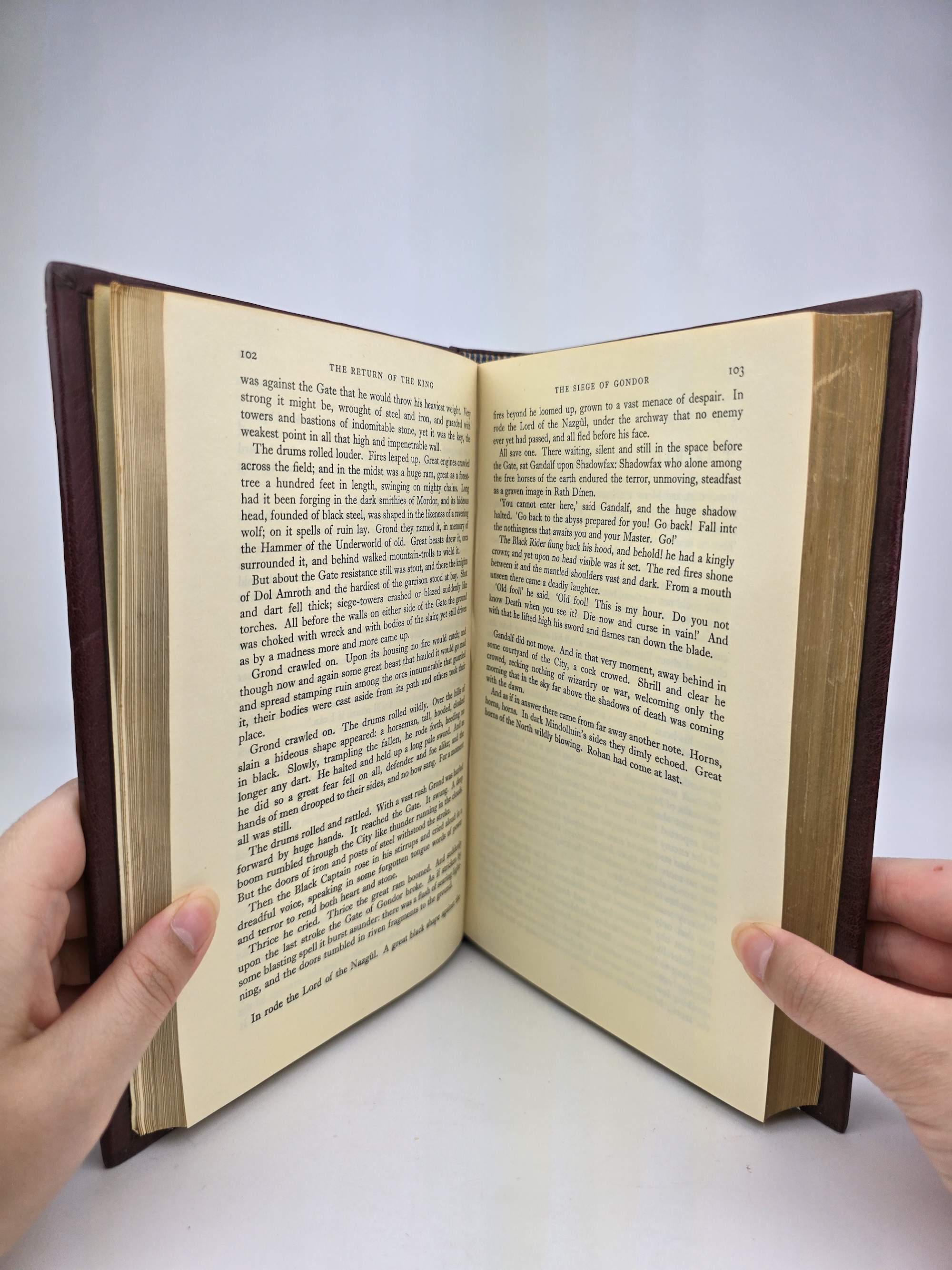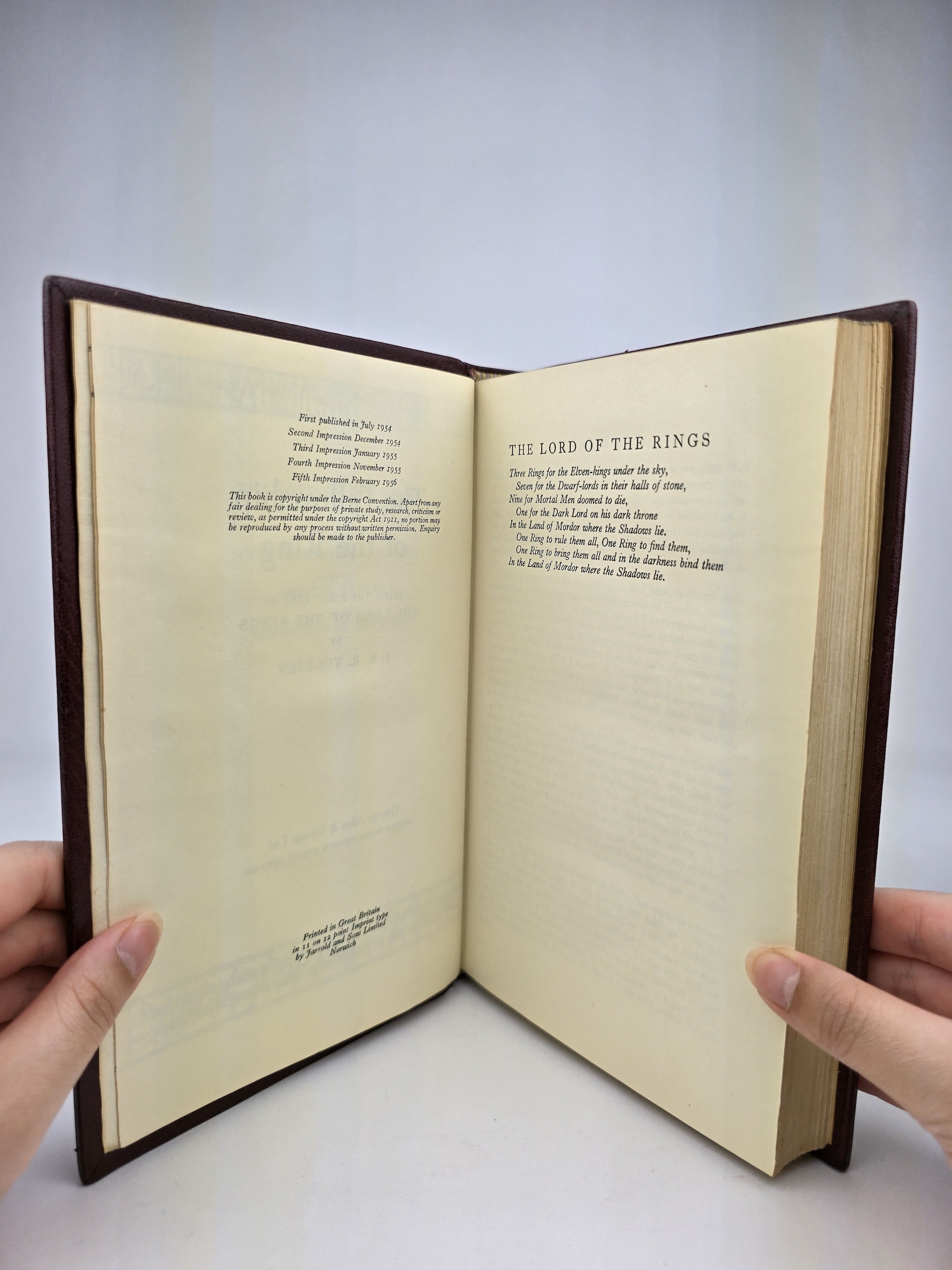A unique rebinding of early UK impressions of The Lord of the Rings, comprising the following: Fifth Impression (1956), Fifth Impression (1957), and Fourth Impression (1958). Each volume has been finely rebound in full dark maroon leather with Tolkien’s Ring and Eye emblem stamped in gilt on the front boards.