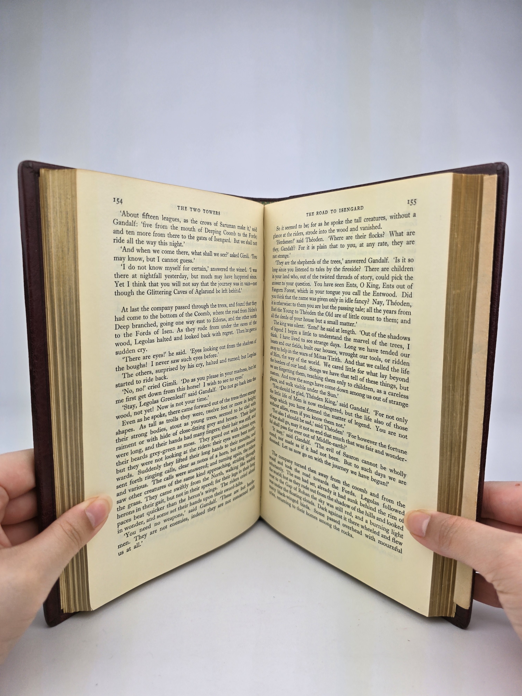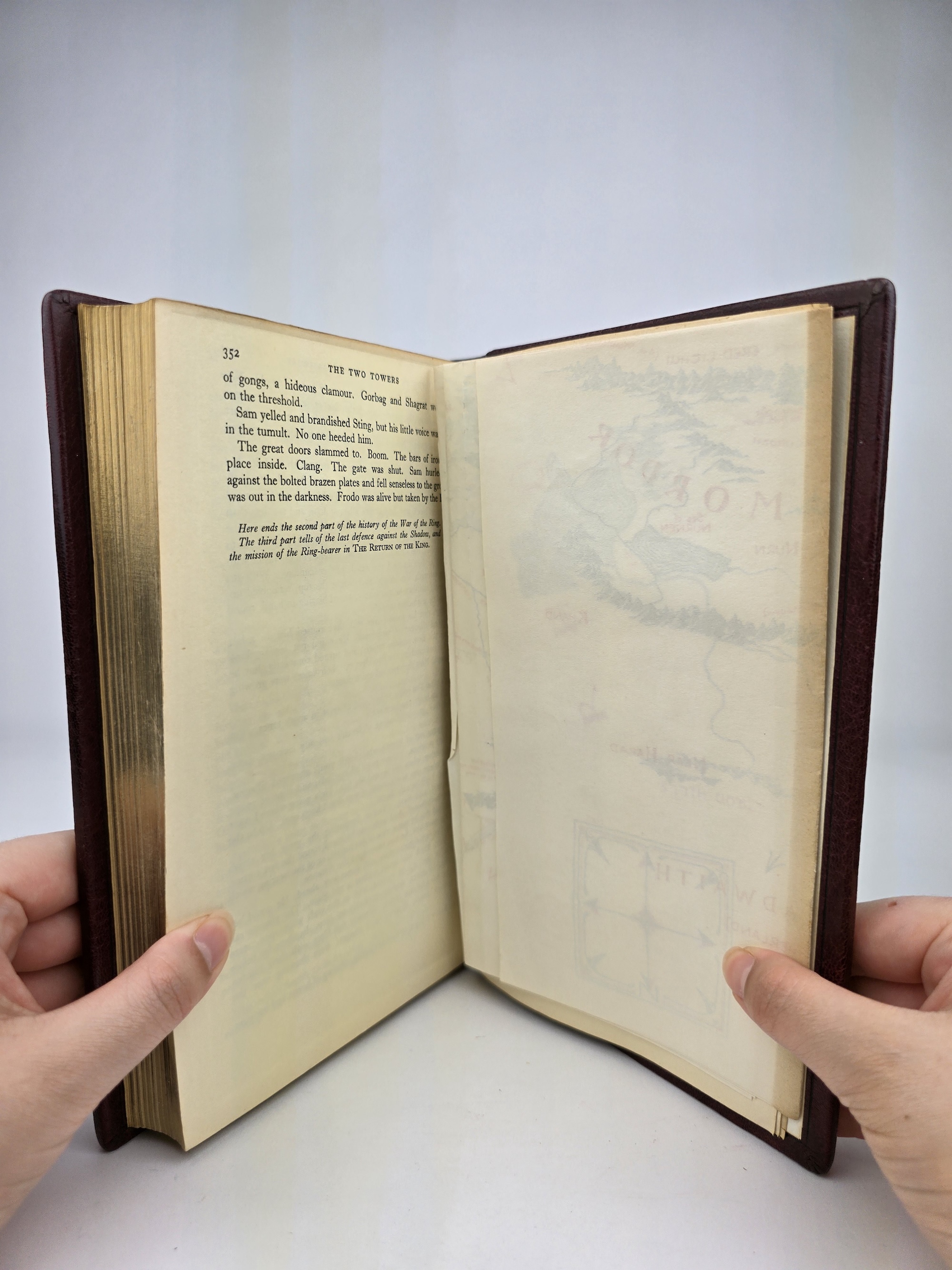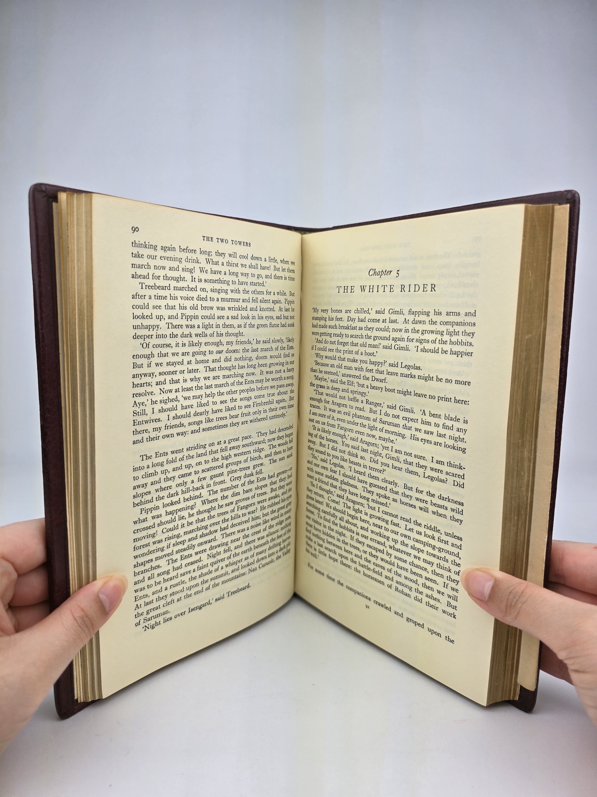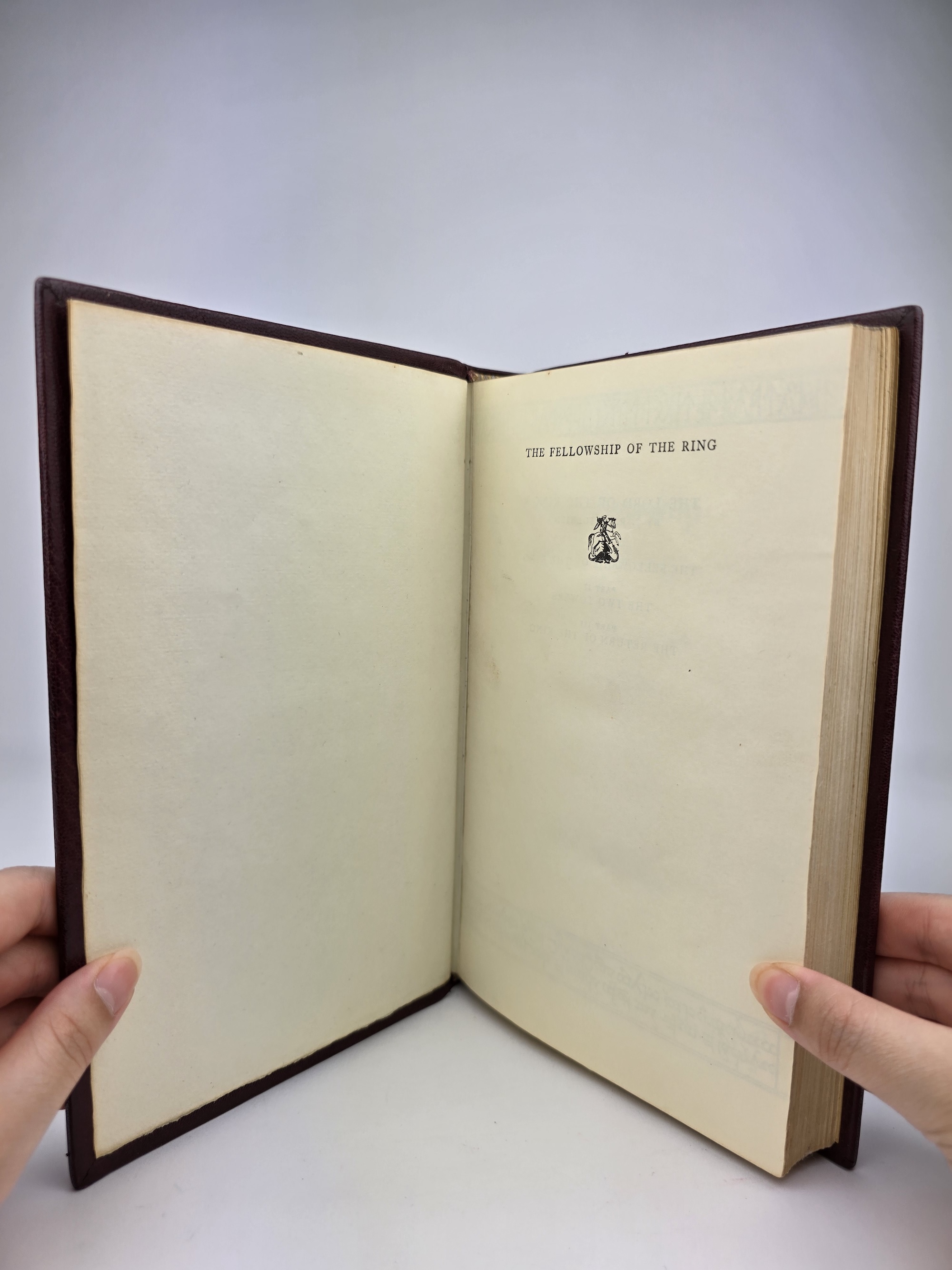 A unique rebinding of early UK impressions of The Lord of the Rings, comprising the following: Fifth Impression (1956), Fifth Impression (1957), and Fourth Impression (1958). Each volume has been finely rebound in full dark maroon leather with Tolkien’s Ring and Eye emblem stamped in gilt on the front boards.