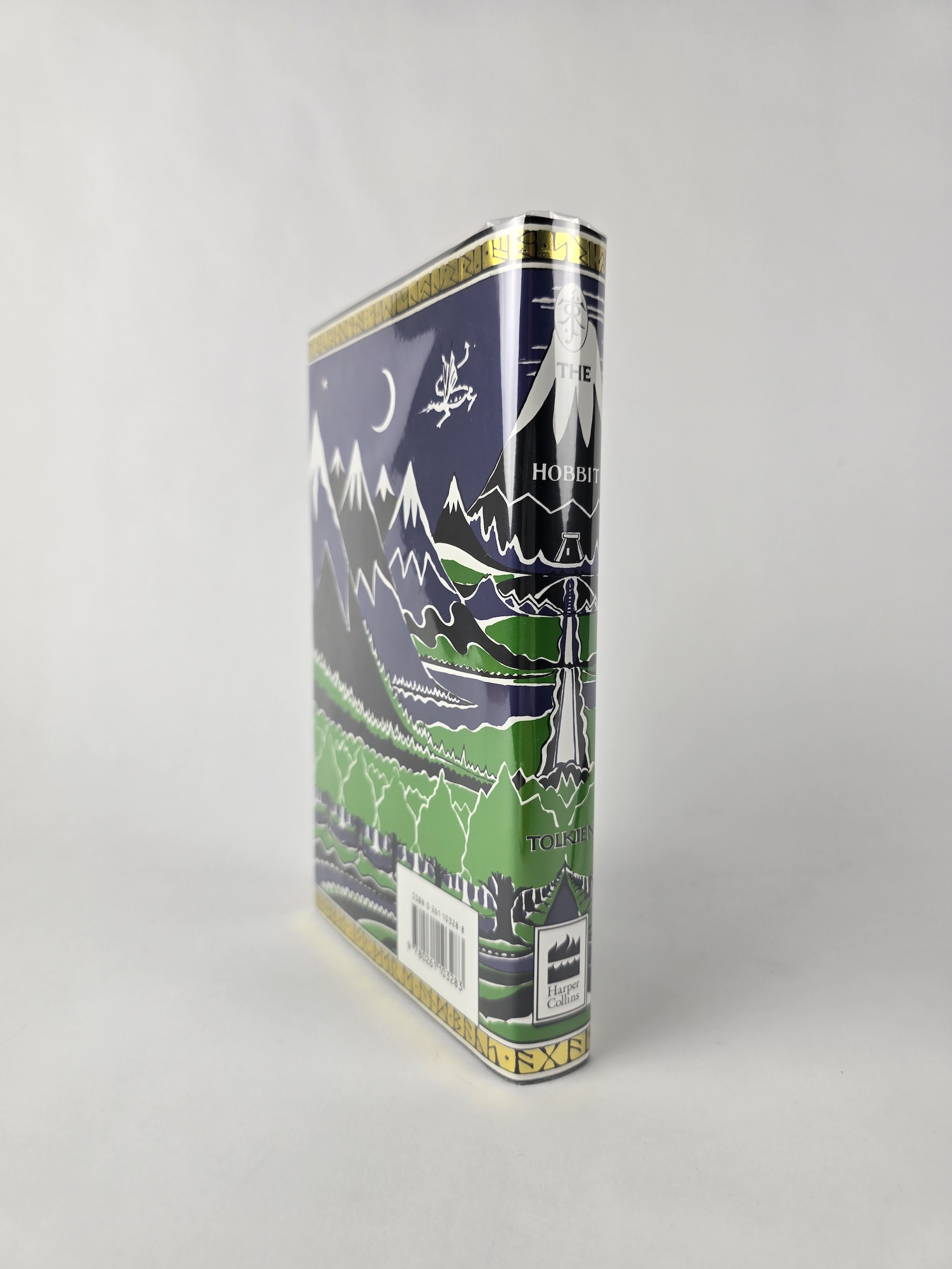 The dust jacket features the classic HarperCollins design with the distinctive gold sun rising over the mountains and the decorative gold runic border framing the top and bottom edges. A particularly attractive and recognisable 1990s HarperCollins Hobbit design.