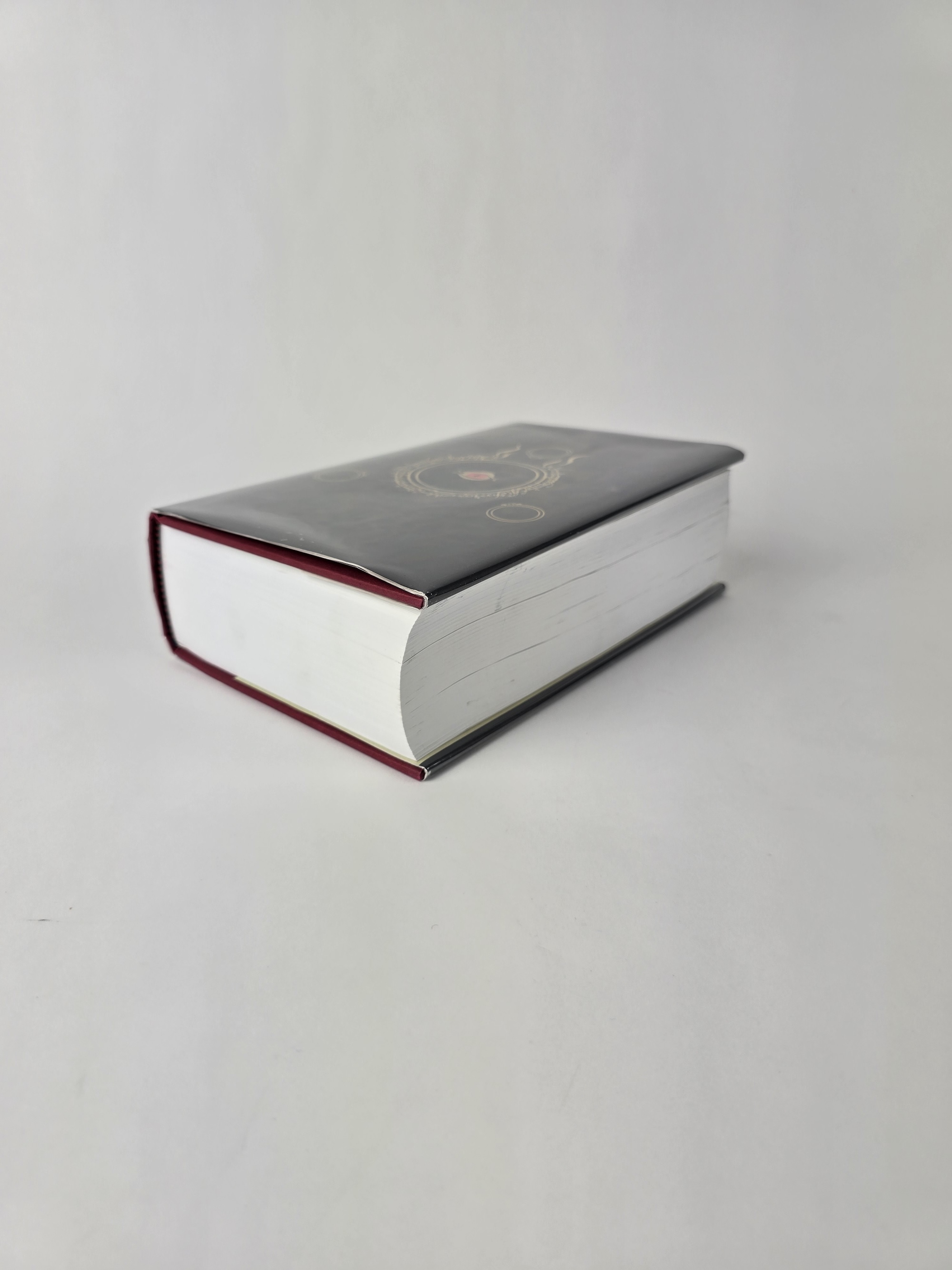 Bound in glossy black boards featuring the gilt circular Ring device with the red Eye of Sauron at the centre, surrounded by Tengwar inscription. The spine carries Tolkien’s monogram and title in gilt. Red endpapers and ribbon marker complete the design. A striking and highly recognisable anniversary presentation.