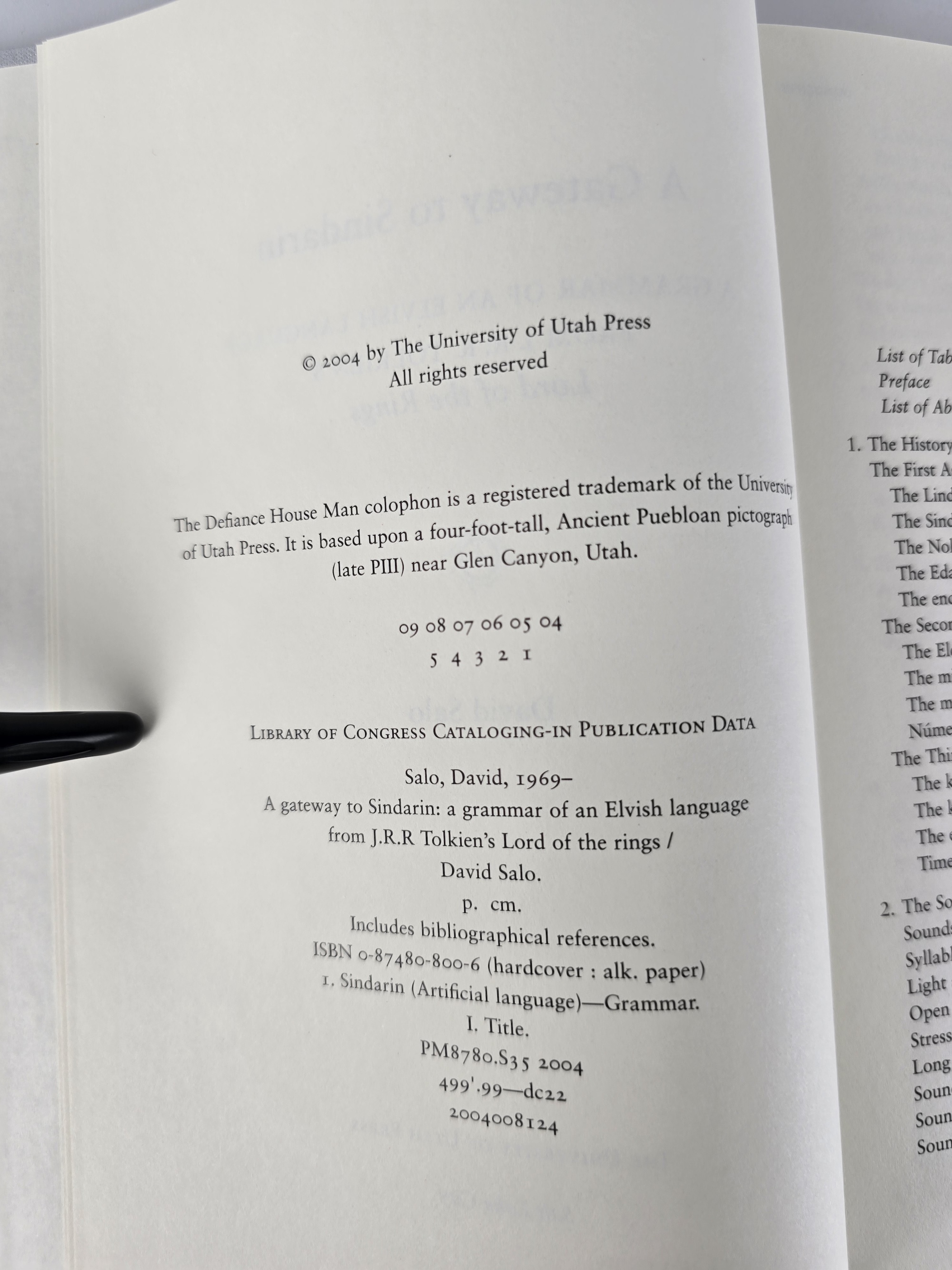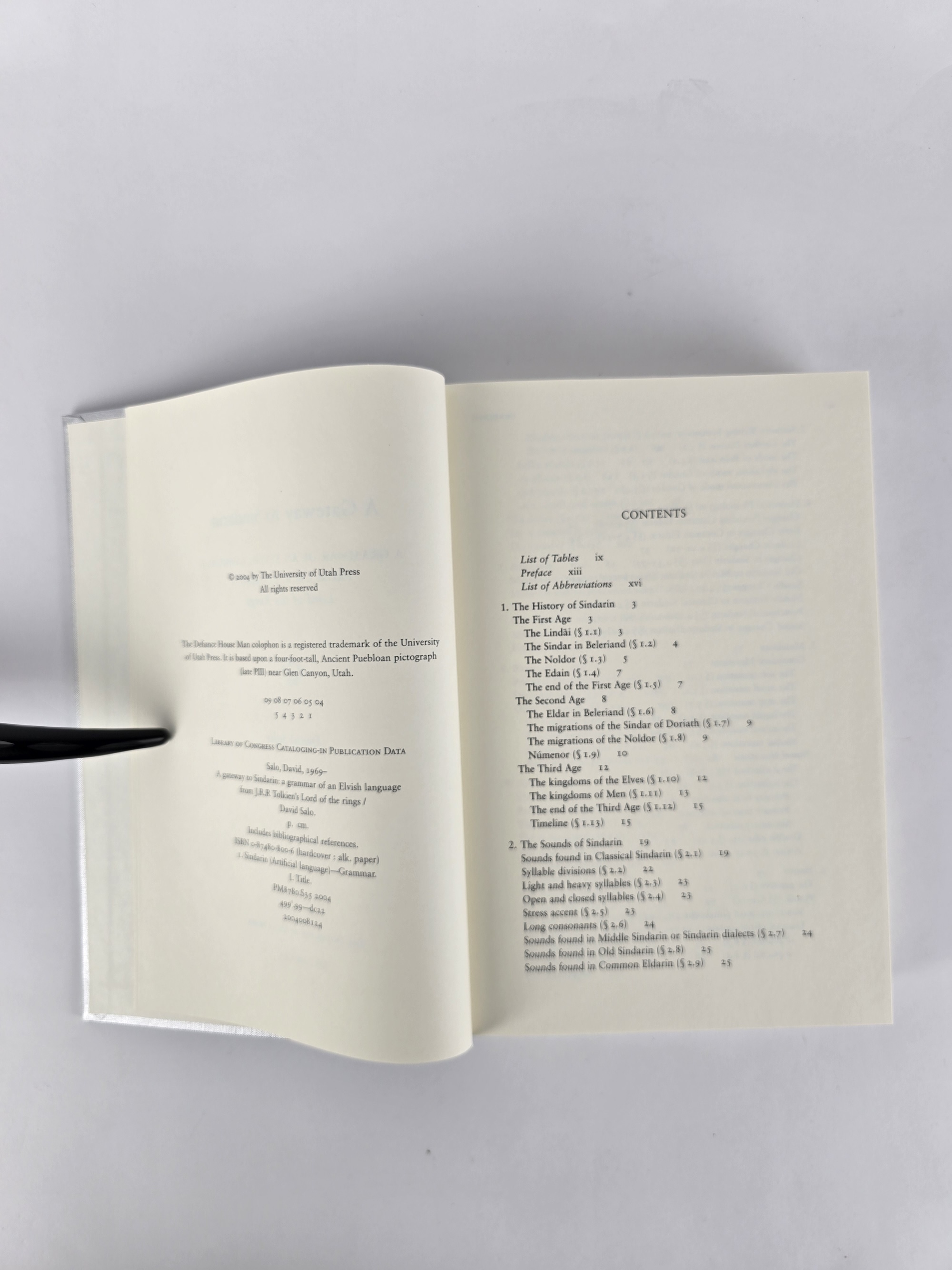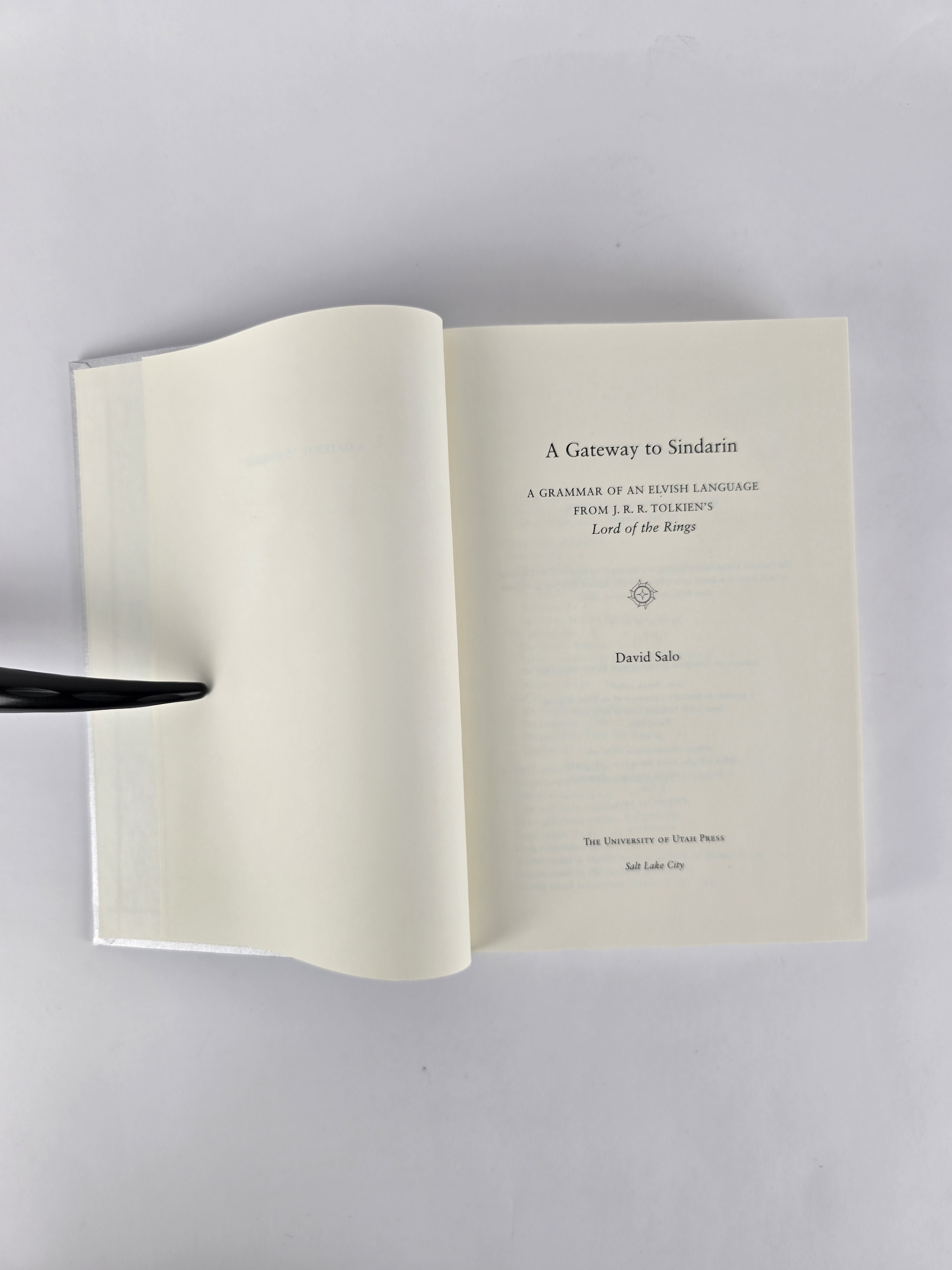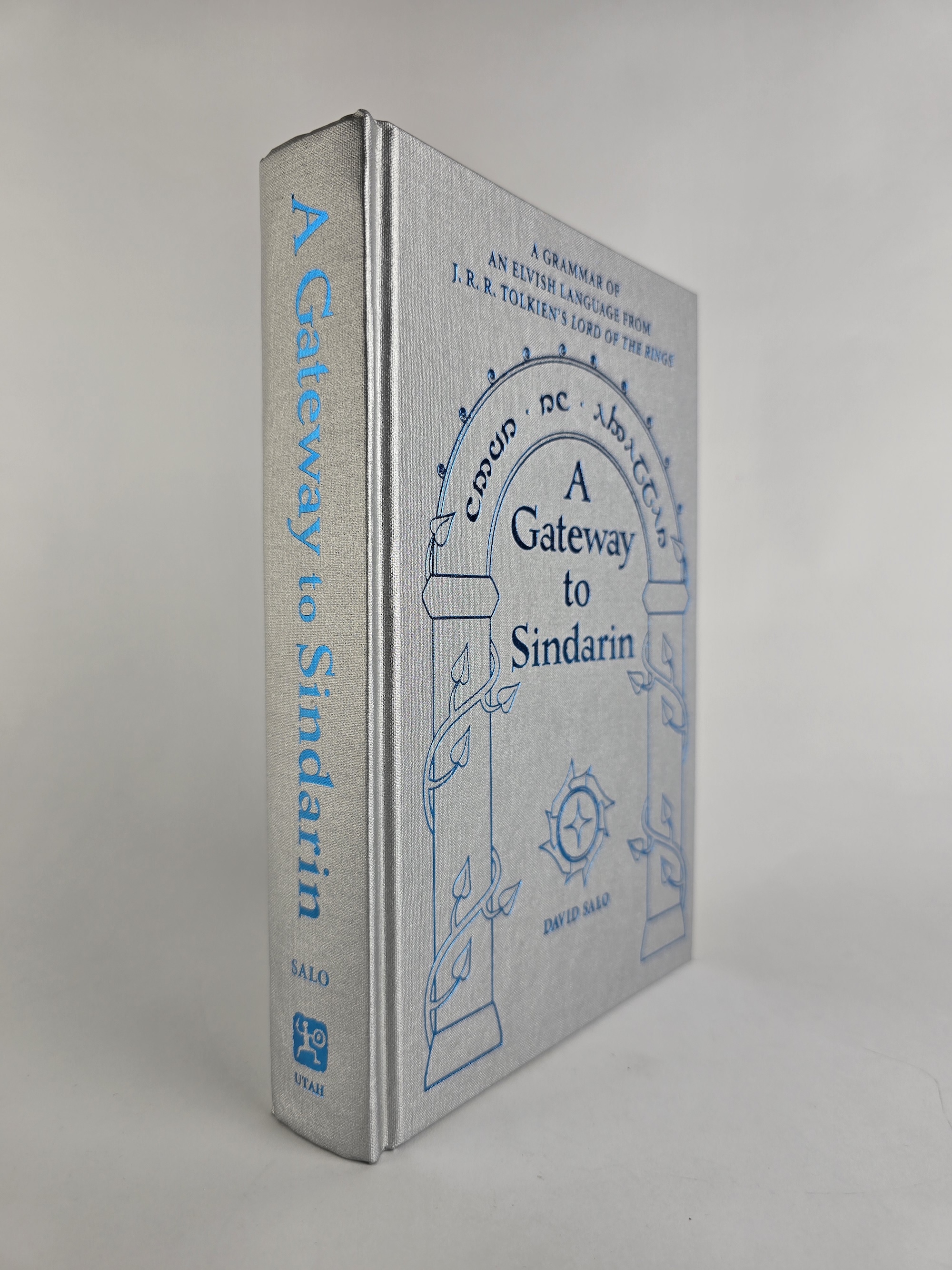 A clean and handsome hardcover copy of A Gateway to Sindarin: A Grammar of an Elvish Language from J.R.R. Tolkien’s The Lord of the Rings by David Salo, published by The University of Utah Press, Salt Lake City, in 2004.