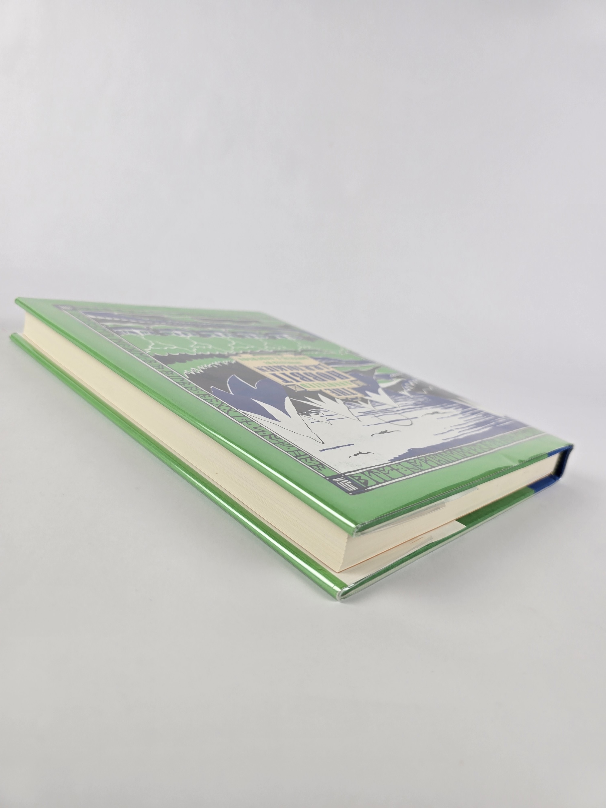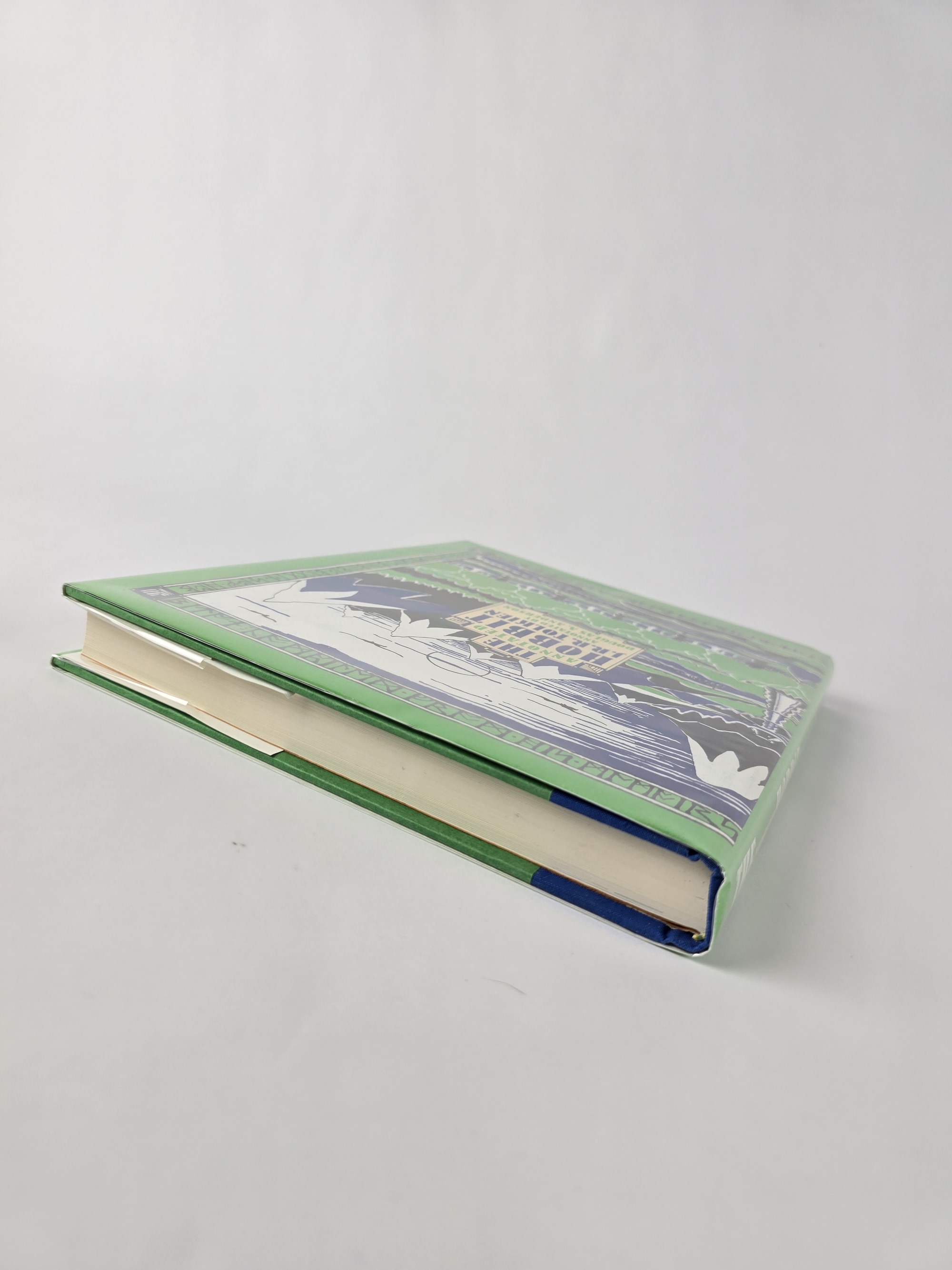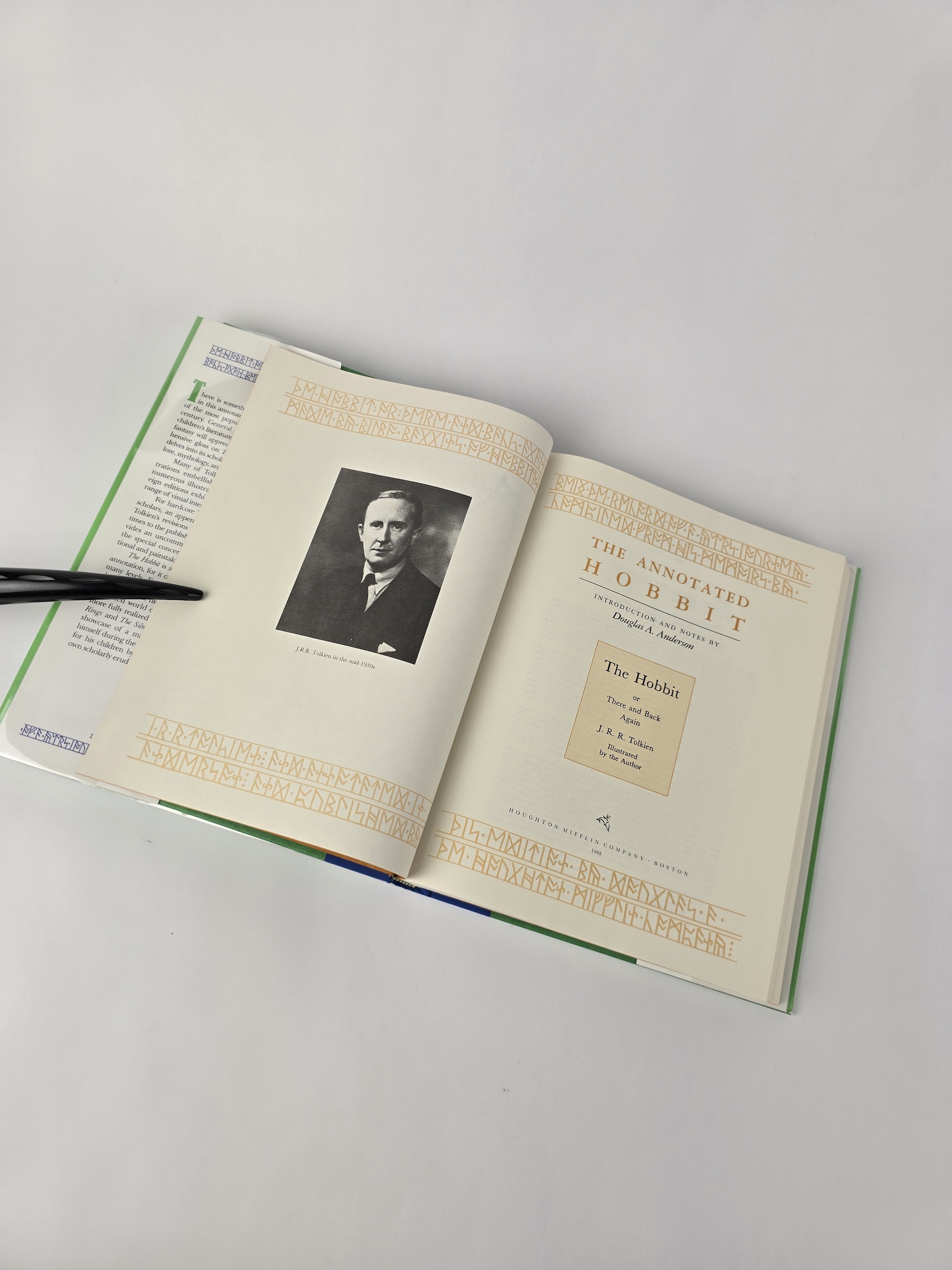 Riddles in the Dark, together with extensive annotations by Douglas A. Anderson. The volume includes numerous illustrations and reproductions, and the main text is typeset following the Houghton Mifflin 1967 Third Edition setting. The decorative runic border printed on the dust jacket reads: